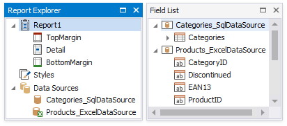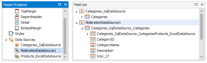 The Data Source Wizard creates a new FederationDataSource that includes two queries with a master-detail relationship. This data source becomes available in the Report Explorer's Data Sources node. The Field List reflects the data source's structure.