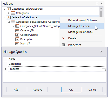 This topic describes how to create a federated data source that retrieves data from multiple data sources. The topic also shows how to specify a master-detail relationship between these queries.