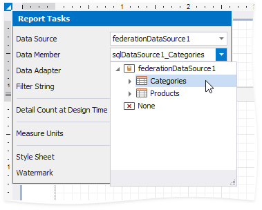 Click the report's smart tag, expand the Data Source property's drop-down menu, and click Add New DataSource.
