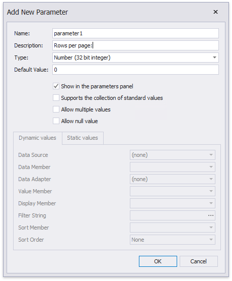 Specify the parameter's description displayed in Print Preview and set its type to Number (Integer).