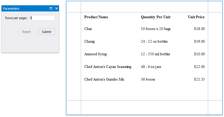 After you bound your report to data and provided content to the report's Detail band, you can limit the number of records each report page displays. This example demonstrates how to pass the required record count as a parameter value.