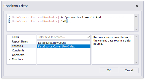 ([DataSource.CurrentRowIndex] % ?parameter1 == 0) And ([DataSource.CurrentRowIndex] !=0)