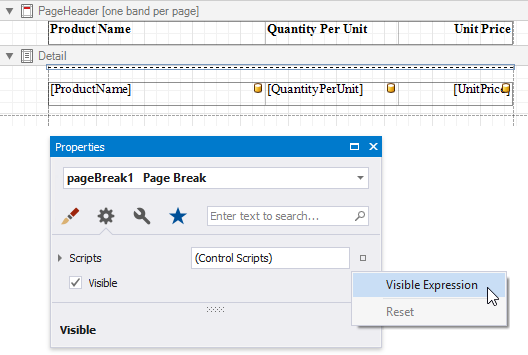 Drop a Page Break control onto the report's detail band and switch to the Property Grid. Open the Behavior tab, click the Visible property's marker and select Visible Expression in the context menu.
