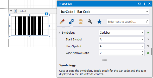 In the property grid, expand the Symbology list and specify the following properties specific to Codabar: