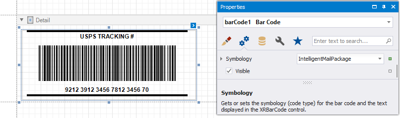 In the property grid, expand the Symbology list and specify the following property specific to Intelligent Mail Package: